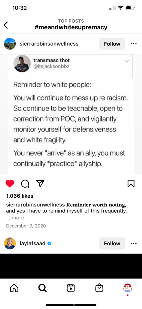 In her Instagram challenge, #MeAndWhiteSupremacy, her soothing voice takes the edge off her directness. This post in particular caught my eye: