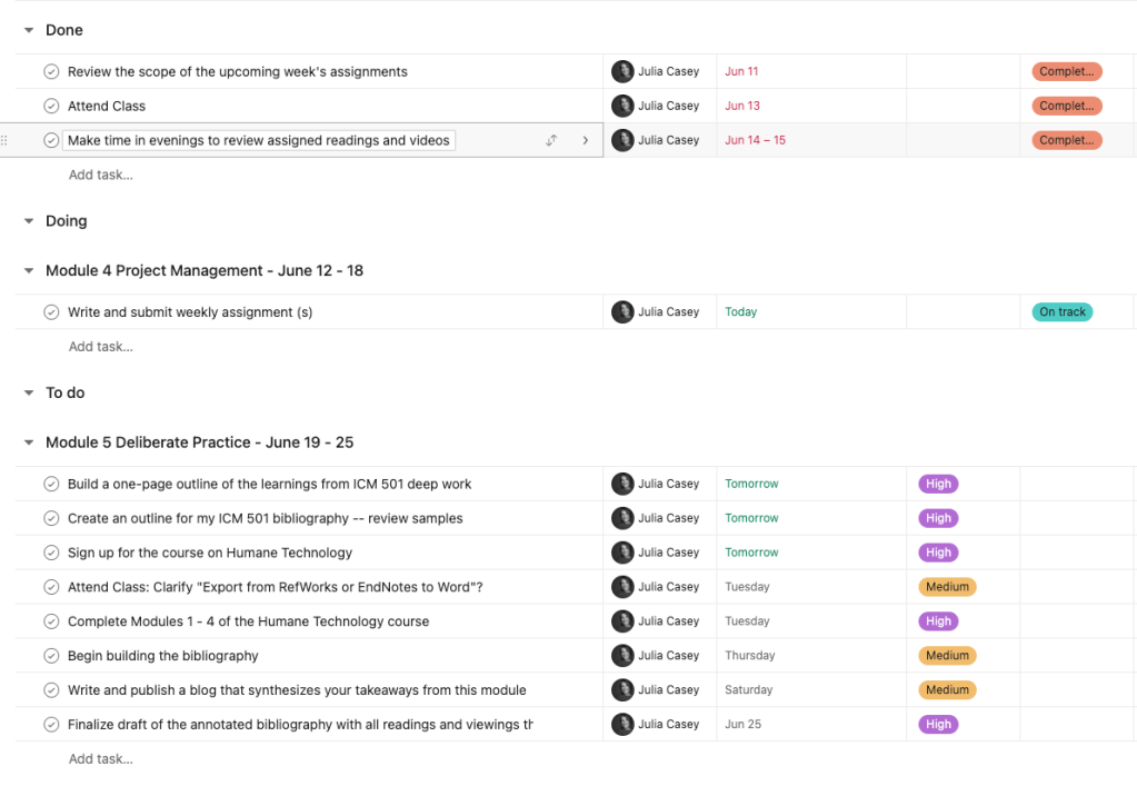 To kick the wheels of the Asana software, I went through Modules 4 – 7 of the ICM 501 class and mapped out key tasks, assigned dates and tested out how to move tasks around and organize the items from week four that I have already done into the “Done” pile. I also tried creating a new status option called “Completed” because finishing something is part of the reward for putting a project plan together in the first place.